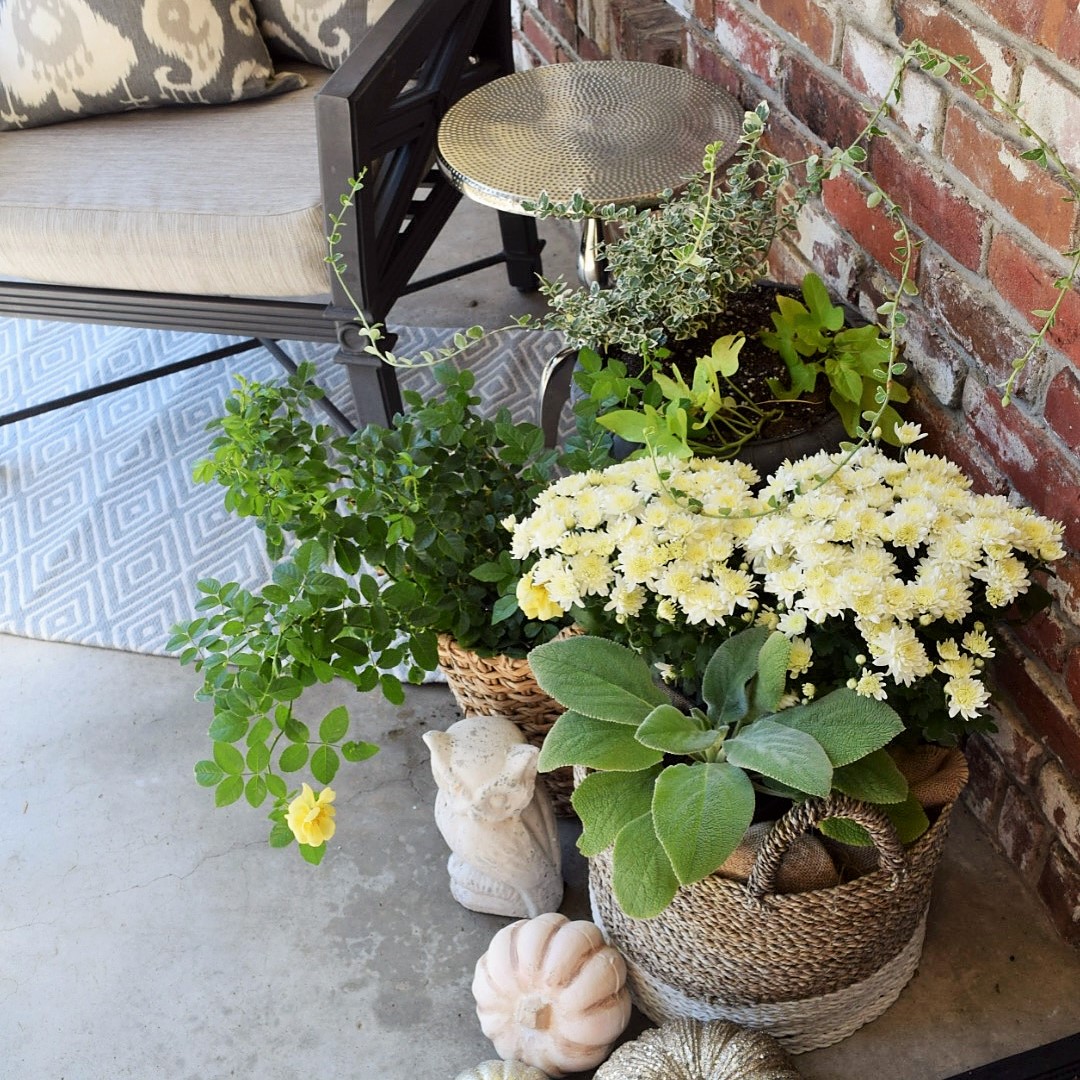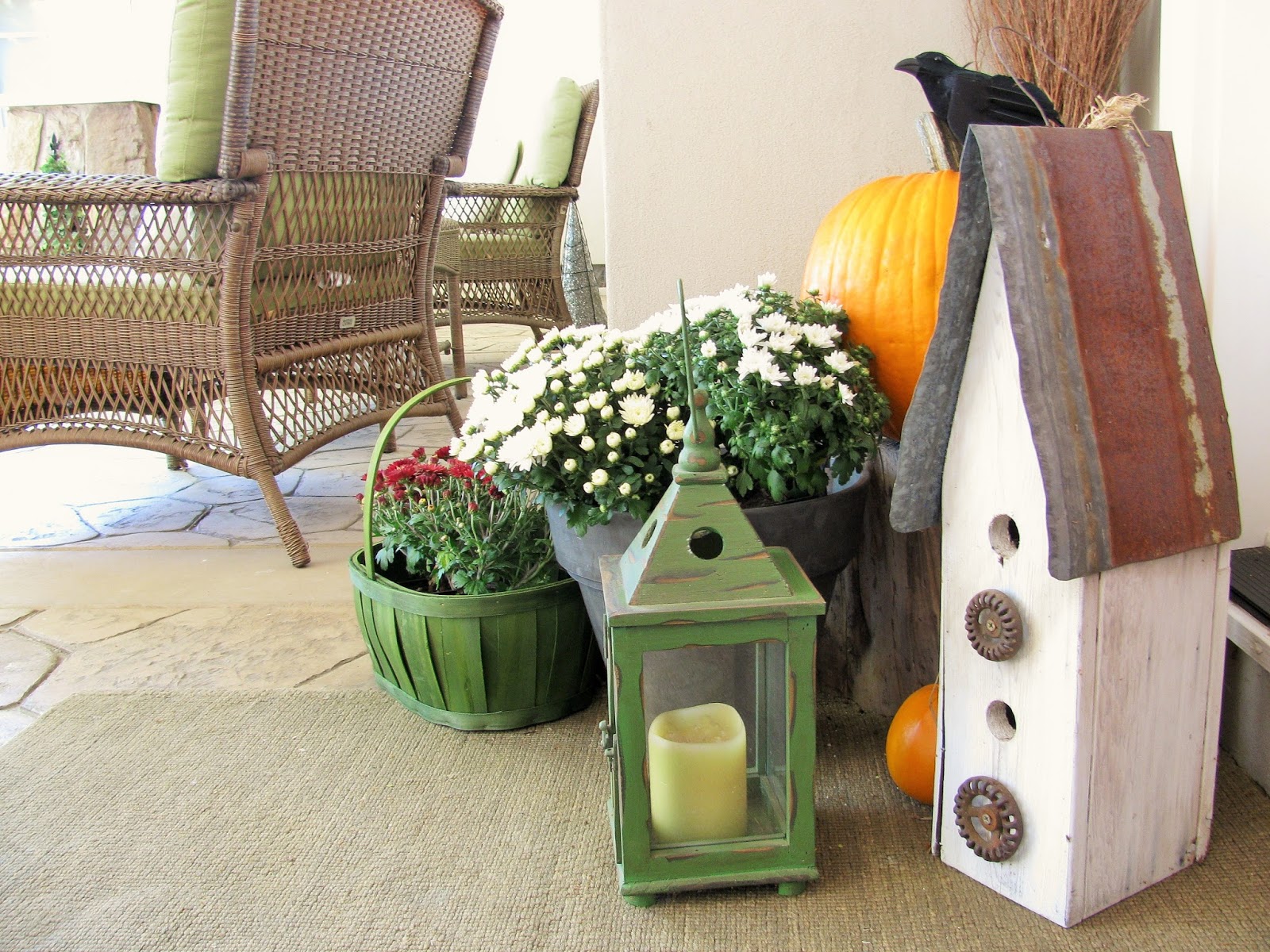 Let’s begin with my porch. I brought out all my planters and bird houses and bought a few chrysanthemums and pumpkins. Right now our fall chrysanthemums are everywhere in the stores and the prices are so reasonable. They make great statements and add such nice color quickly.