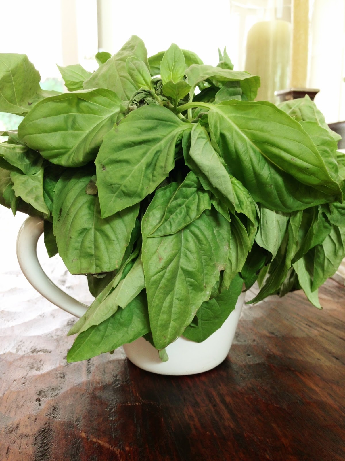 i just love to grow basil during the summer, but this year i didn’t get around to planting any. so instead of having it in my garden, i just cut some stems and placed it in a mug of water. it will last for weeks as long as the stem are in water. pretty cool. i have tried doing this in the winter from the store bought basil and i haven’t had any luck. not sure why. so here is how you do this simple task…