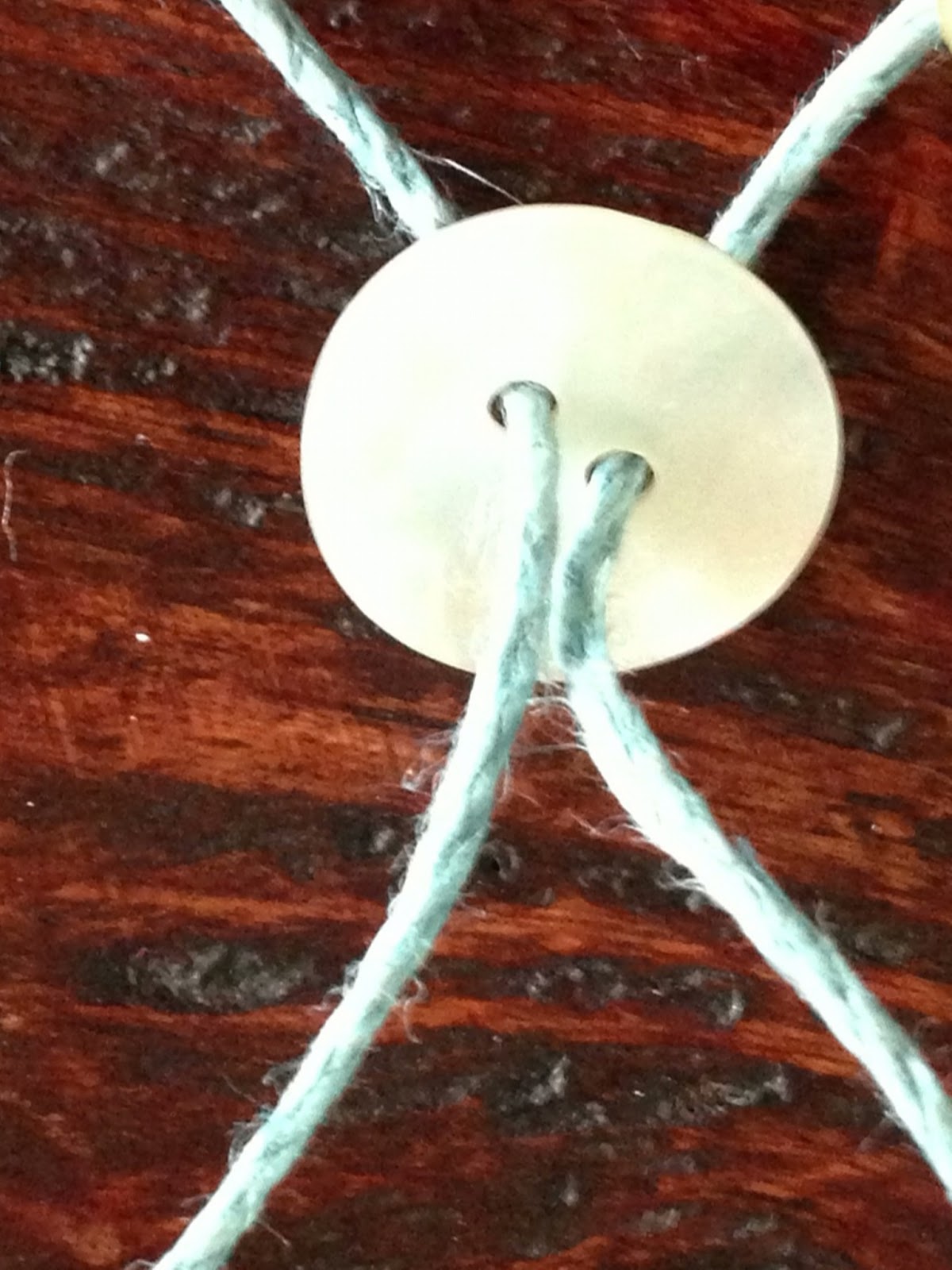 next if you want to make a fun string decoration, here is how i made mine. i used some hemp string and tied three pearl buttons to them.