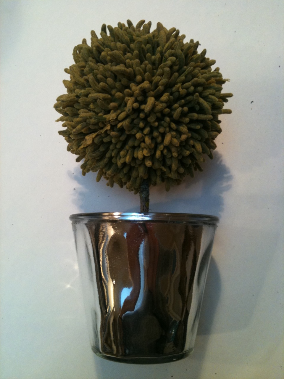 definitely put the whole topiary together before placing it into the styrofoam, you don’t want to move it around once it is in the stuff, otherwise it gets loose and your topiary starts to lean in ways you don’t want it too! i didn’t do that here… and i learned my lesson. if you look closely mine leans a little…. :o)