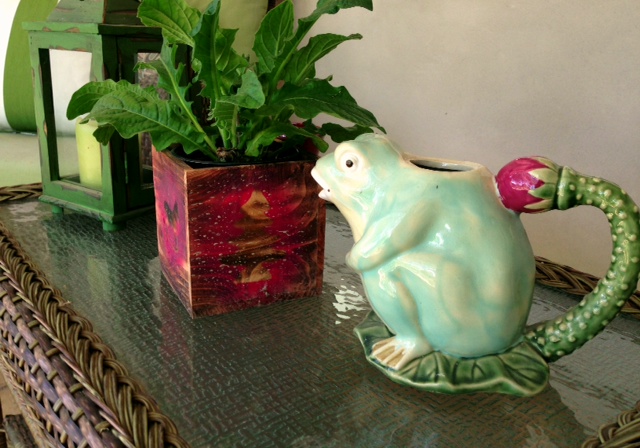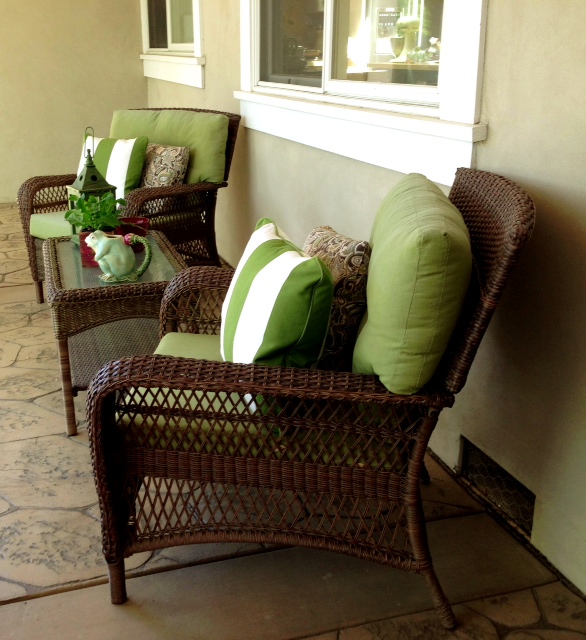 i think the table and chairs are martha stewart’s outdoor furniture line at home depot.  i just bought the green stripe sunbrella pillows at costco.  of course they were really reasonable…2 for $24!!!