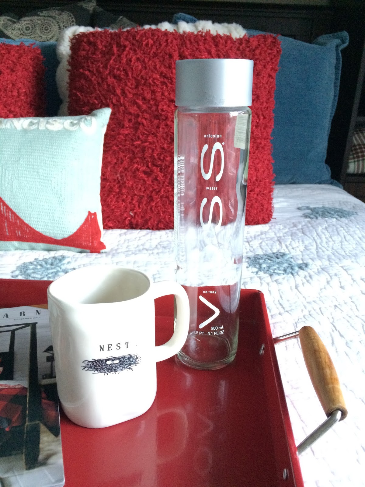 I like to buy VOSS water bottles and leave a coffee mug or glass in the room. I love the sturdy glass bottle and my guest can take it home with them. ย My guests don’t have to go rummaging for a drink in the middle of the night either, they have water right in their room. In the morning, they can bring their coffee mug down for a cup of joe or hot tea. ย Don’t you love this little “nest” mug we bought from Homegoods?