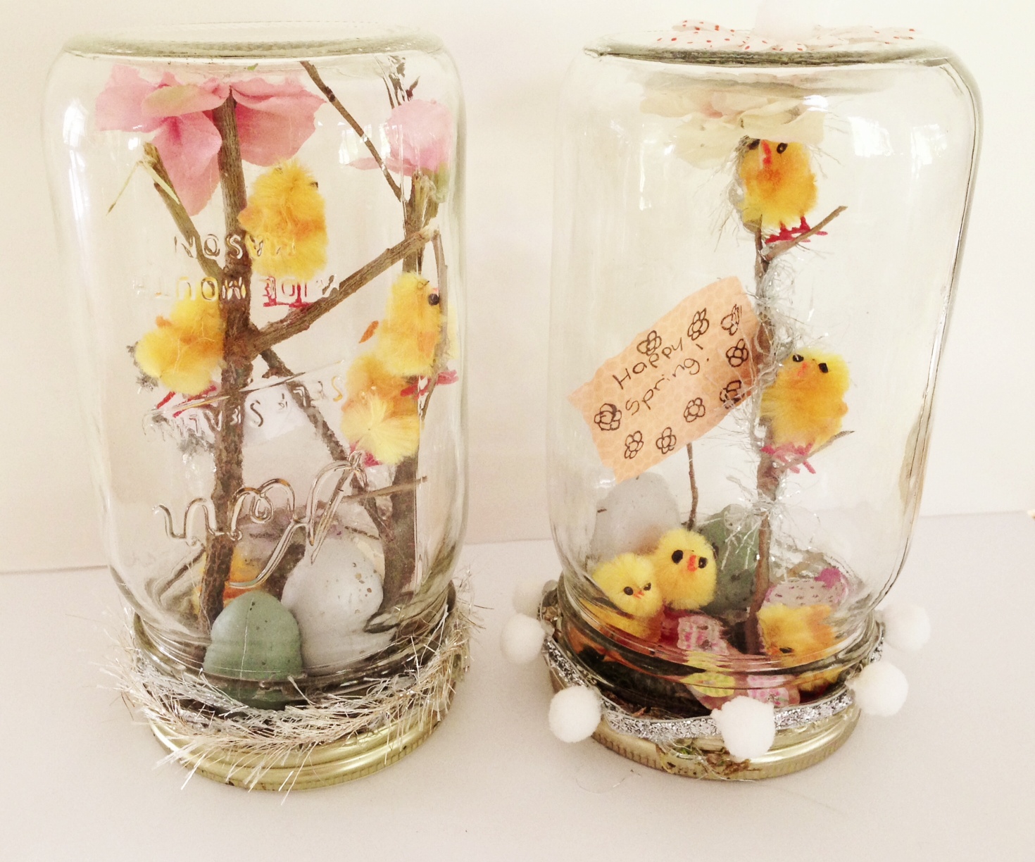 My daughter and her friend made up this spring Mason jar project all on their own! They used a large mason jar and added moss, eggs, silk blossoms, sticks and Easter chicks! The possibilities are endless since there are so many cute craft items to add to the scene. I love that they both had the same supplies, and both jars turned out different. Creativity is so unique and awesome.