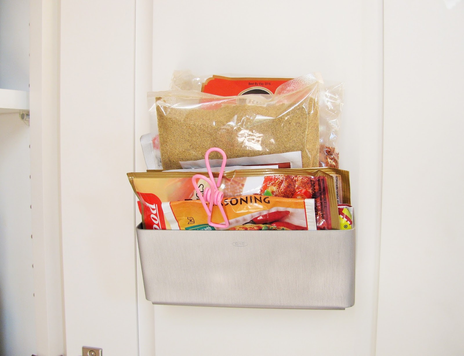 Then, I thought it would be nice to use the space on the doors. These little suction cup shelves work great. Their original use is to attach to a sink and hold your dish rag, but they work nicely on the inside of my cabinet doors to hold the miscellaneous cooking packages. Here is a link: Suction Cup Basket