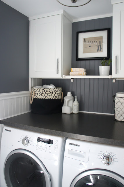 Here are some other photos of their laundry space. I love the bead board, the contrasting and crisp colors, and I really love the hanging rack. Note to self: “Get one of those!”