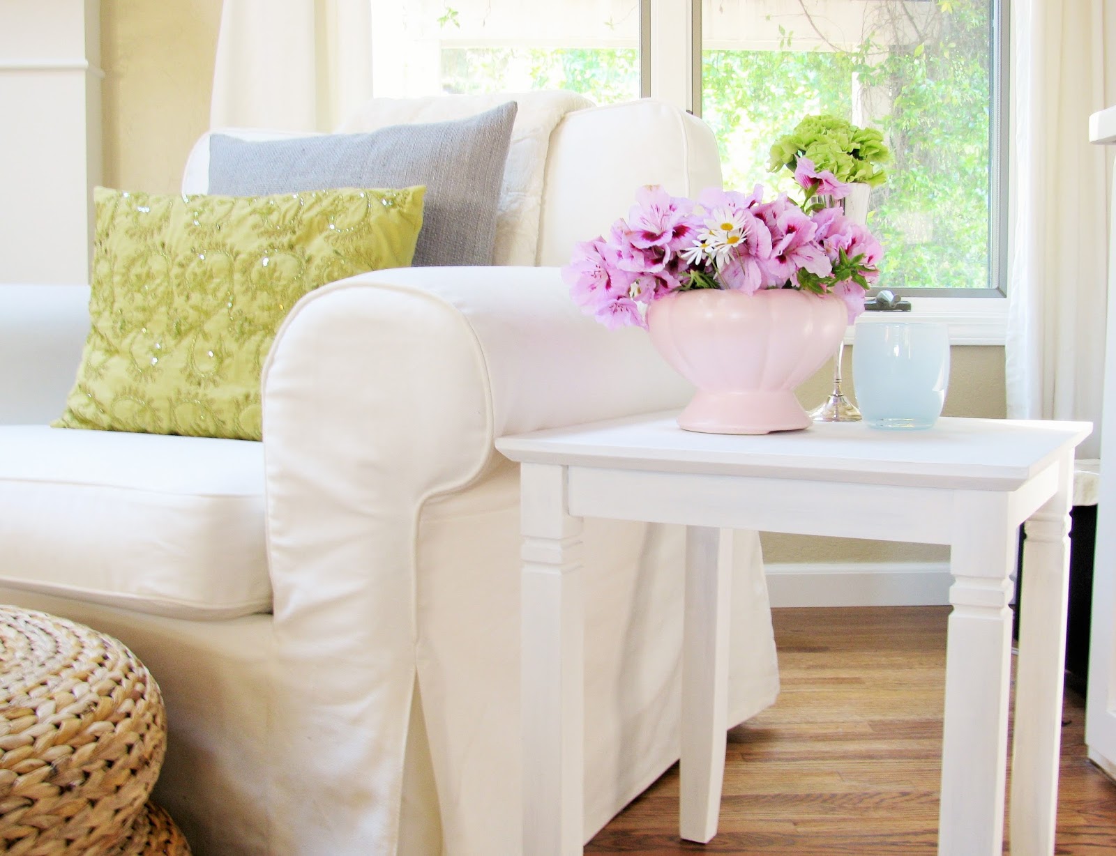 I found this fun little table at Goodwill. It was originally a mahogany colored table which I covered with white chalk paint. I also, special ordered a glass top to protect it from our beverages, sorry that this photo doesn’t show the glass. The table was $15 and the little pink vase was a couple of dollars. I love the vase and it’s pale pink color. Also, the Ikea Ektorp chair I found on Craigslist for $30. I ended up buying a new slipcover for $29 and tada a new chair! Here is the post: Ikea Chairs